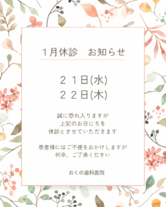 休診のお知らせ 2026.01.13 新年を迎えてから はやくも2週間が経ちましたね。 お正月気分は抜けましたか? 1月の休診のお知らせです。 冷え込む日が続いています。 お身体に気をつけてお過ごし下さいね。